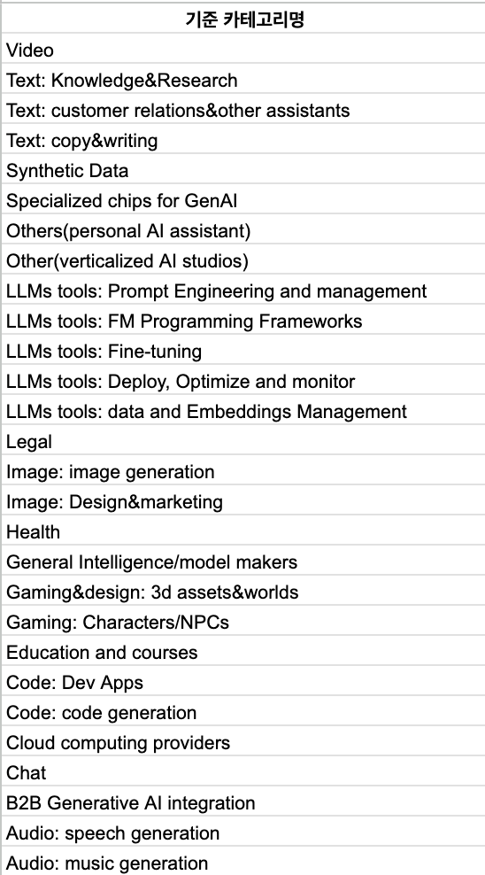 연구 이야기를 쓰려고 쓰기 시작한 글은 아니기 때문에 방법론에 대해 자세히 다룰 필요는 없지만, 한국과 미국의 생성형 AI 스타트업이 어떤 분야에서 많이 창업했는지 보기 위해 이들의 분류 체계를 기준으로 삼아 작업을 했었다. 앞서 말한 것처럼 작업에 기준이 필요하기 때문에 참고했었는데, 결론적으로 진행하면서 꽤나 아쉬웠다.